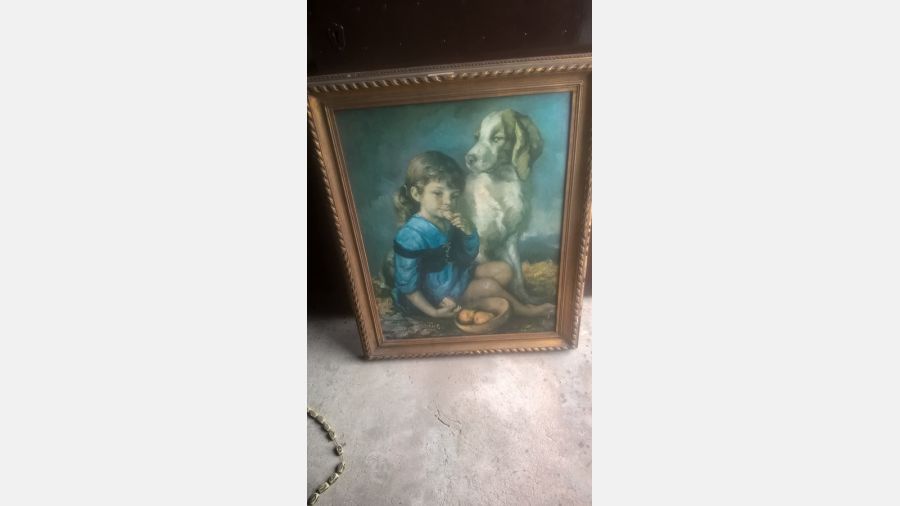 Fantástica replica de quadro de Franscisco Ribera de 1966 " A menina e o cão" impresso em platex com linda moldura dourada.